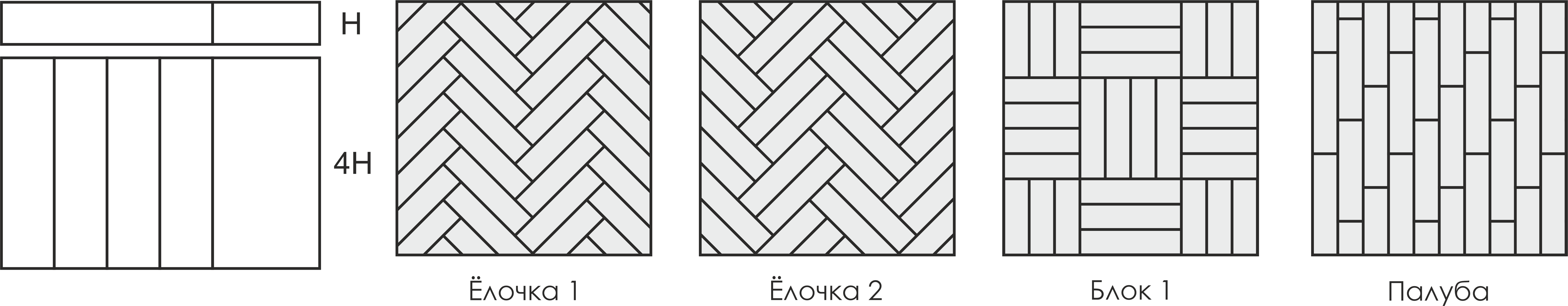 При укладке блоками важно помнить о кратности размера плашек. В коллекции Herringbone плашка в длину равна 4-ем плашкам в ширину. С учетом этого можно создавать различные блоки и их сочетания.