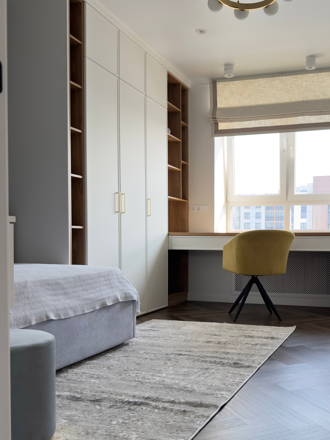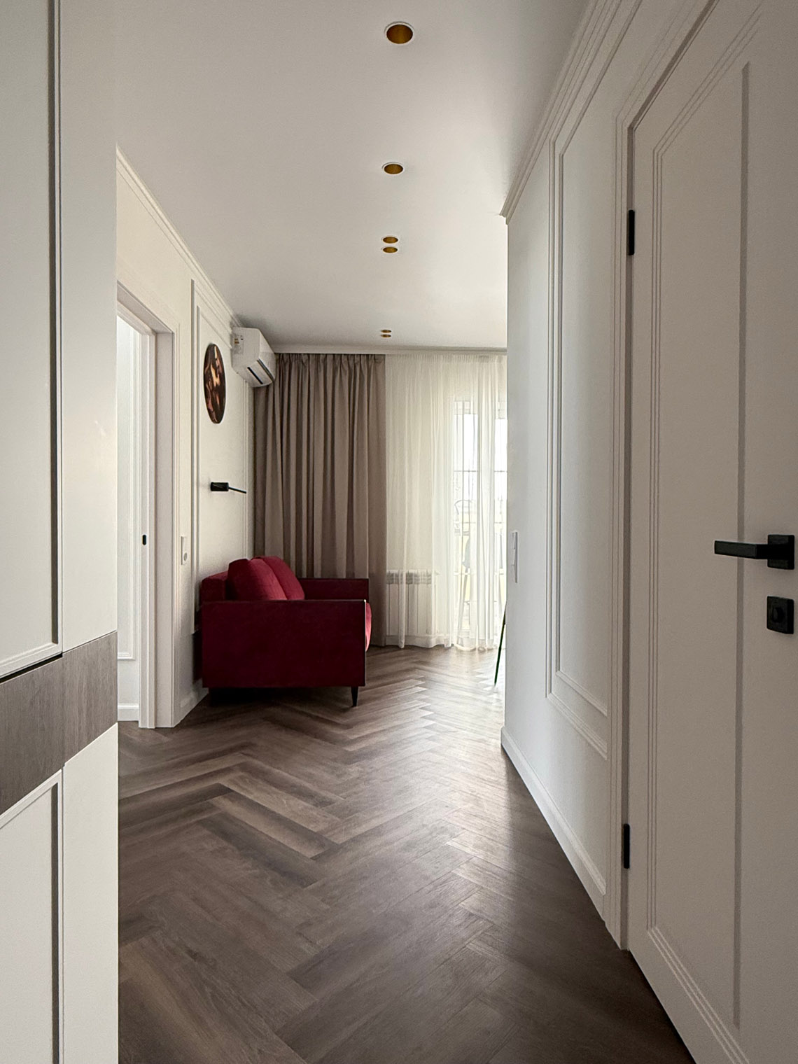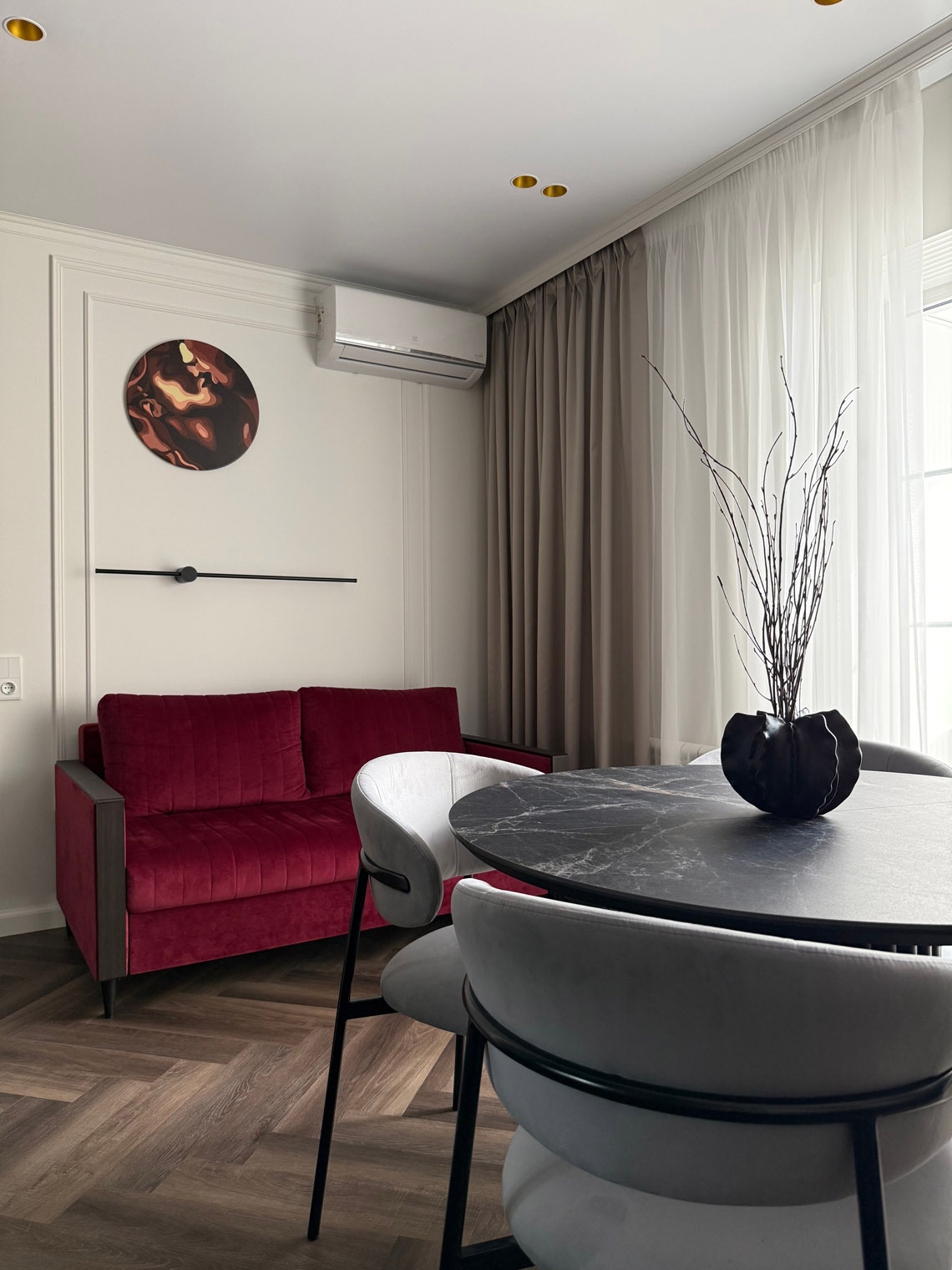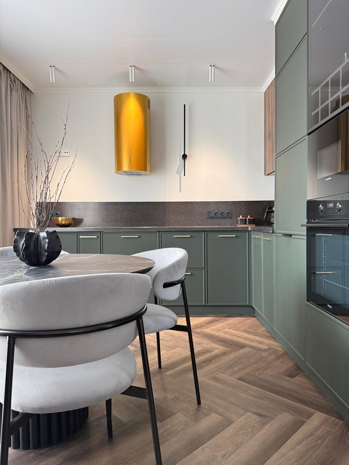 В основе этого интерьера — смелый контраст: белоснежные стены + темная мебель. То, чего многие избегают, здесь выглядит безупречно. Кварцевый ламинат в укладке мелкой «ёлочкой» добавил пространству графичности и поддержал насыщенную цветовую палитру.
