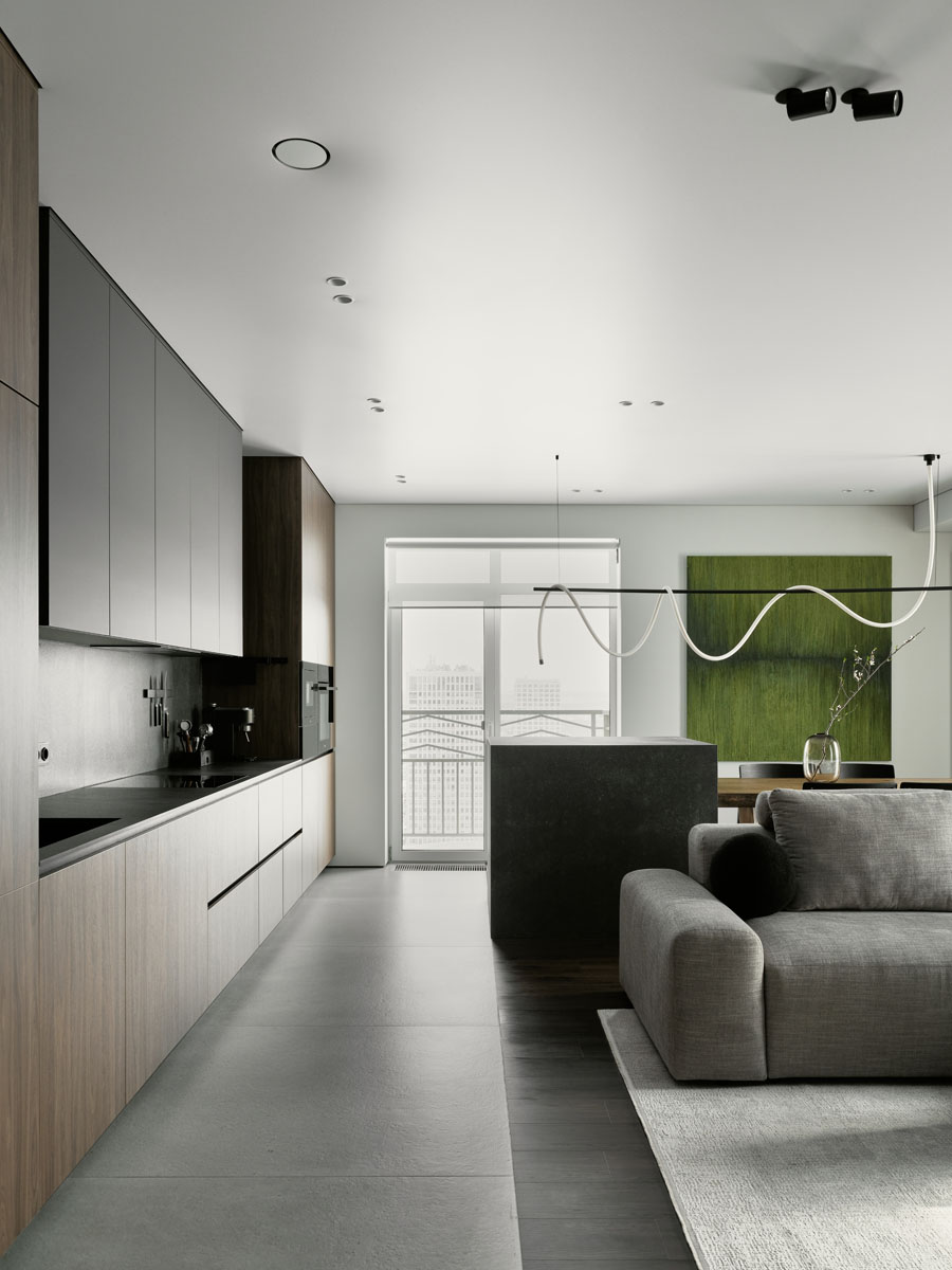 Для квартиры 97 м² с панорамным видом на Обь создали стильный и удобный интерьер по четкому запросу заказчика. В отделке объединили темное дерево, фактуру камня и природный зеленый цвет, на пол уложили практичный кварцевый ламинат Fargo.
